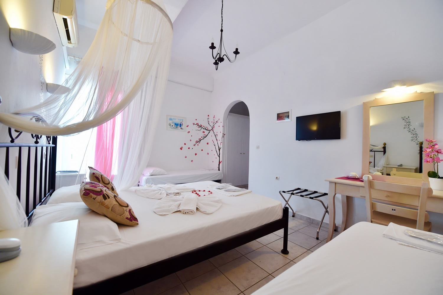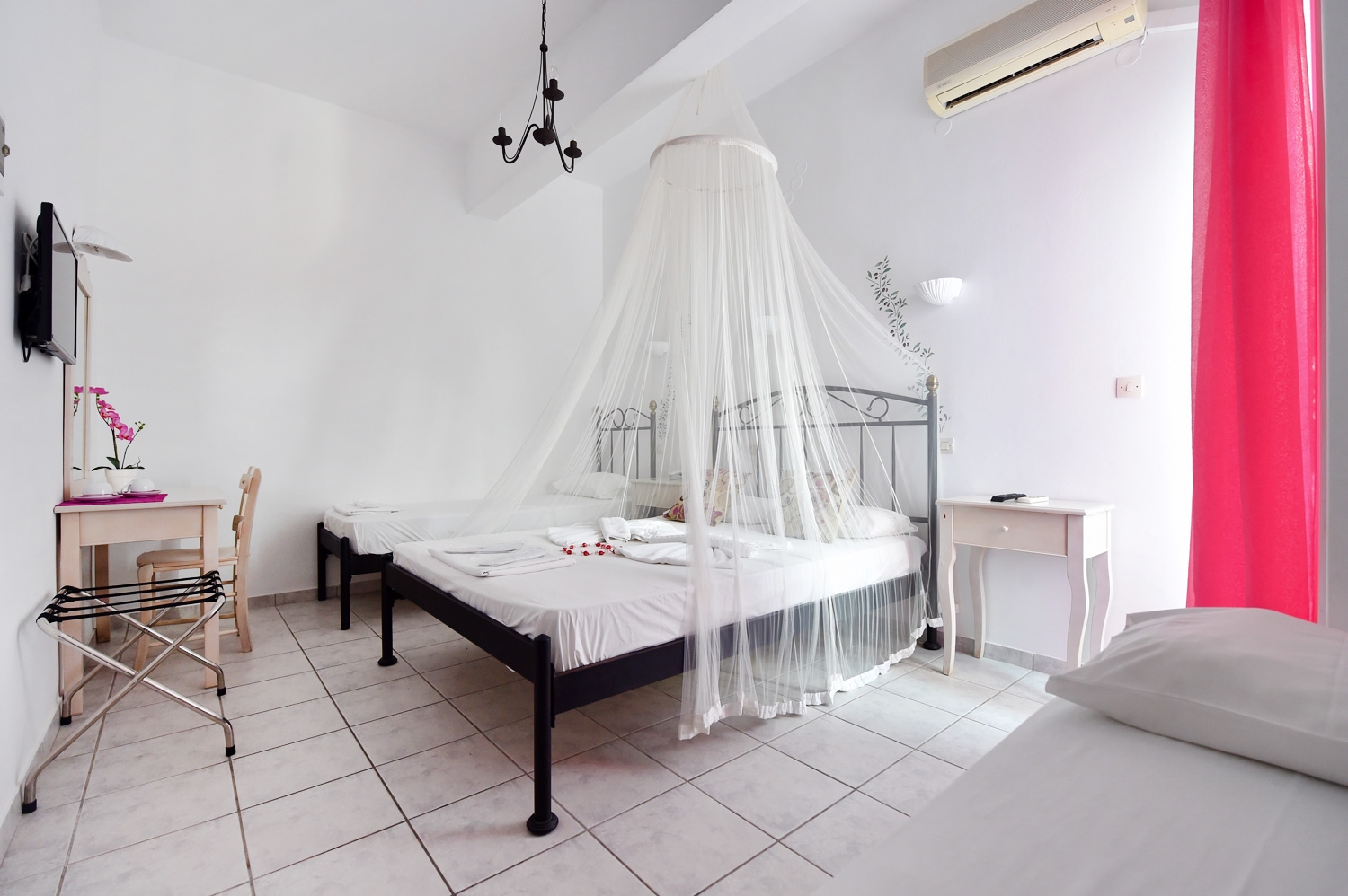 This room has one double and two single beds or four single beds or two double beds, bathroom and private balcony. All rooms are build and furnished with the old traditional style of Cyclades.