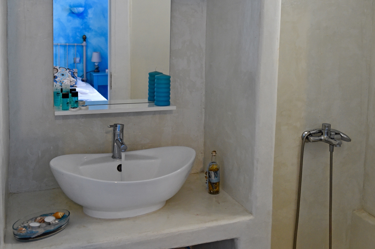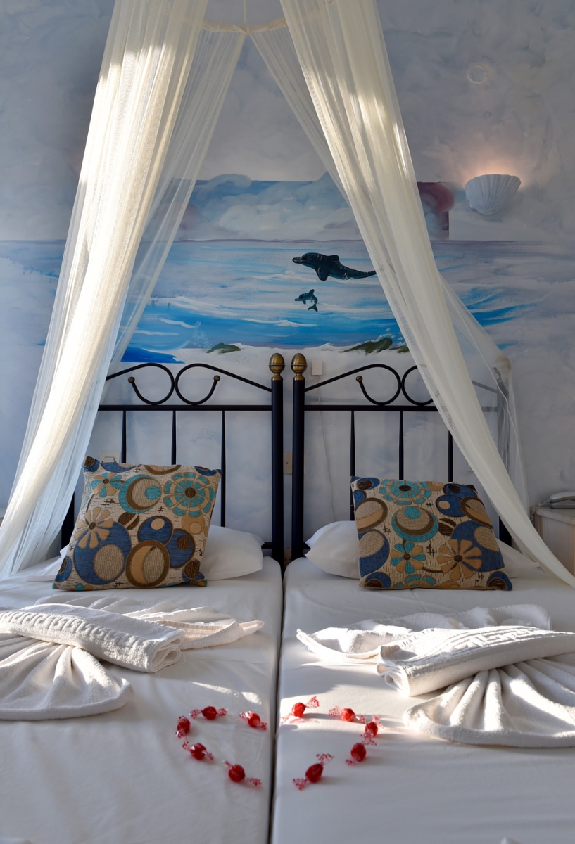 Double standard room with one double or two single beds, private bathroom and balcony, build and furnished with the old traditional style of Cyclades.