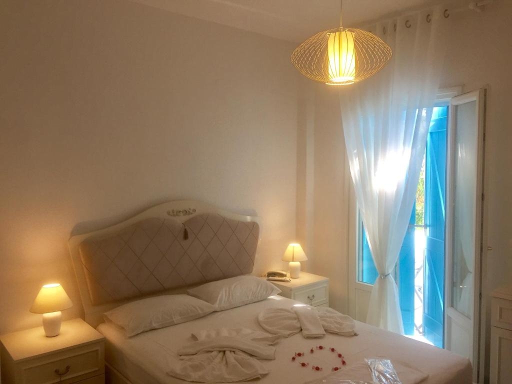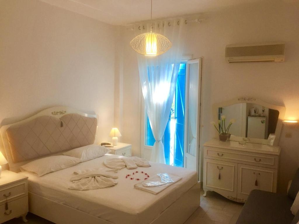 Room with two separate bedrooms with two balconies and two bathrooms with one double bed and the single bed in one bedroom and the other bedroom three single beds. All rooms are build and furnished with the old traditional style of Cyclades.