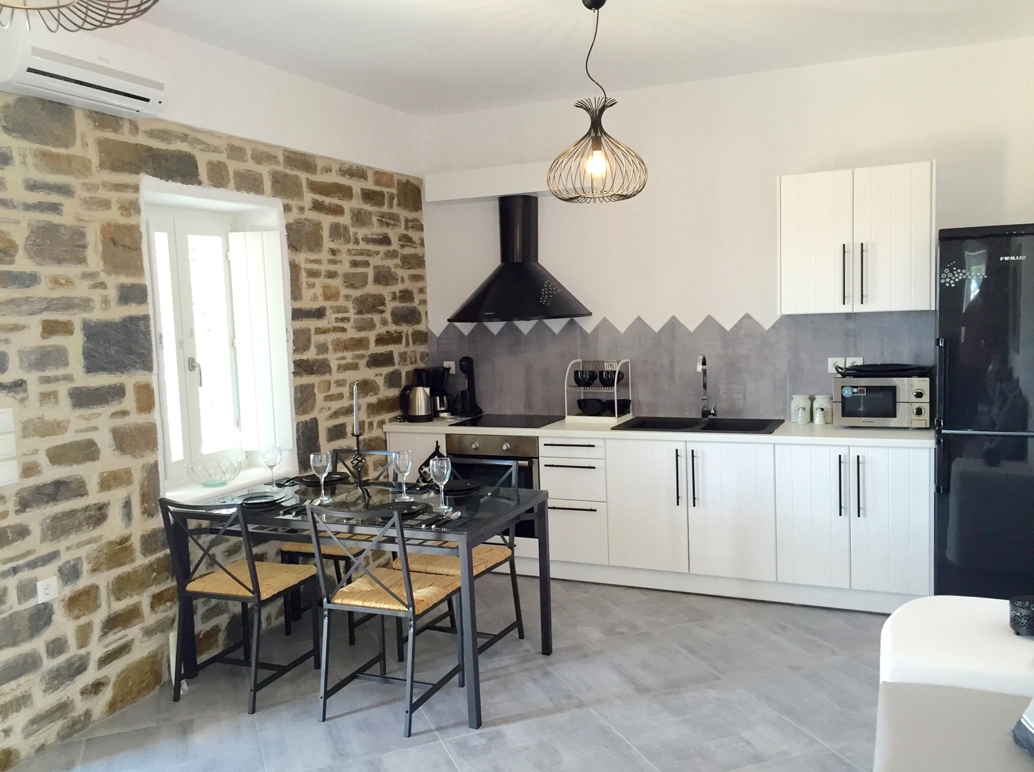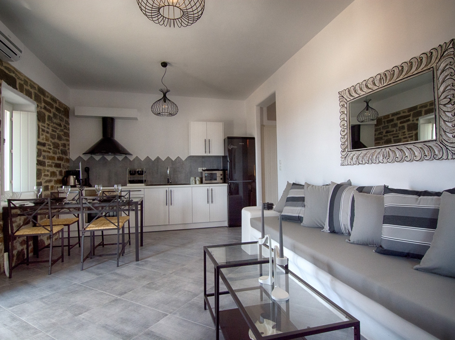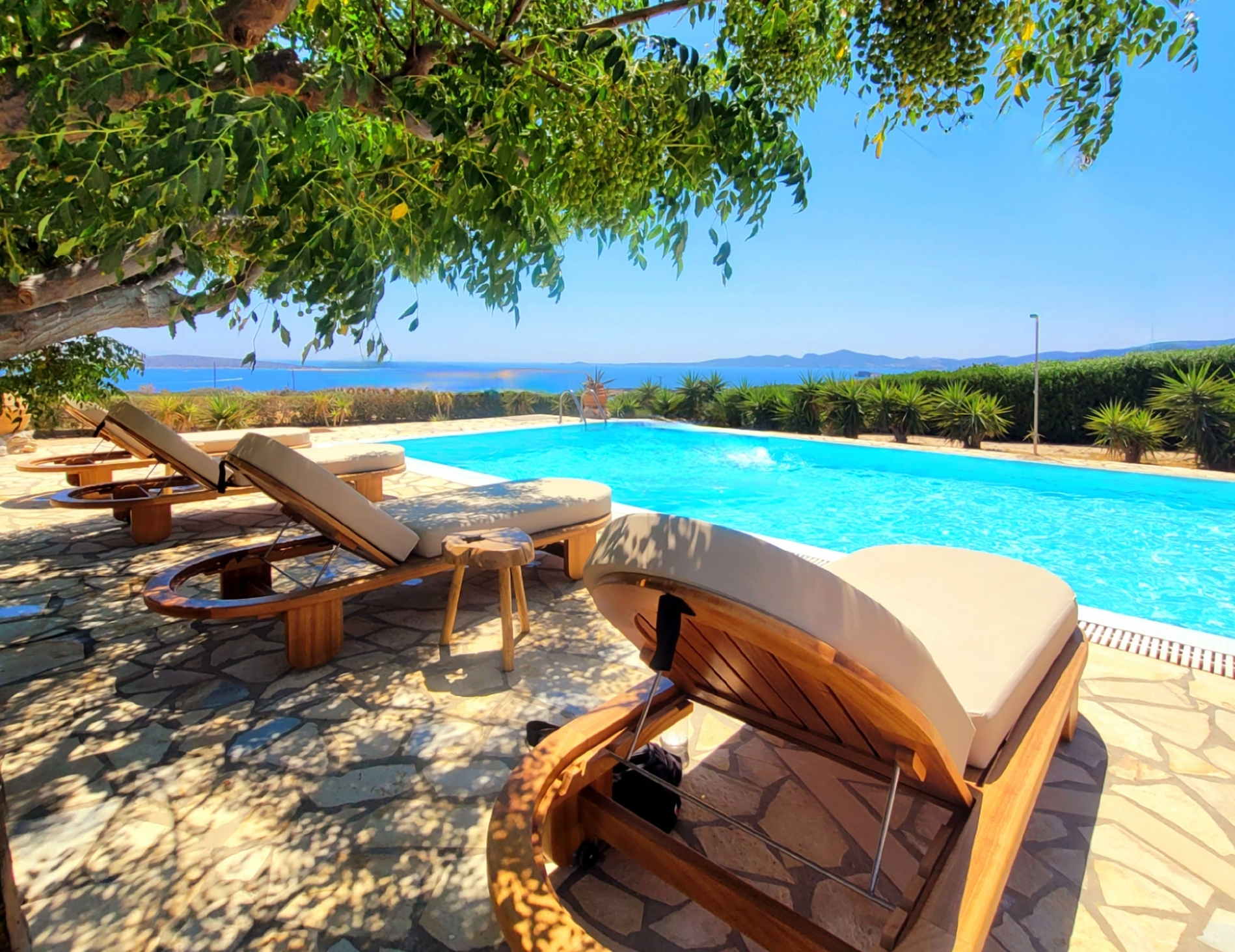 This villa comes with a spacious living room, 2 fully equipped kitchen, 4 separate bedrooms, 2 single sofa beds, 1 double sofa bed and 4 bathrooms. It offers views over the Aegean Sea.